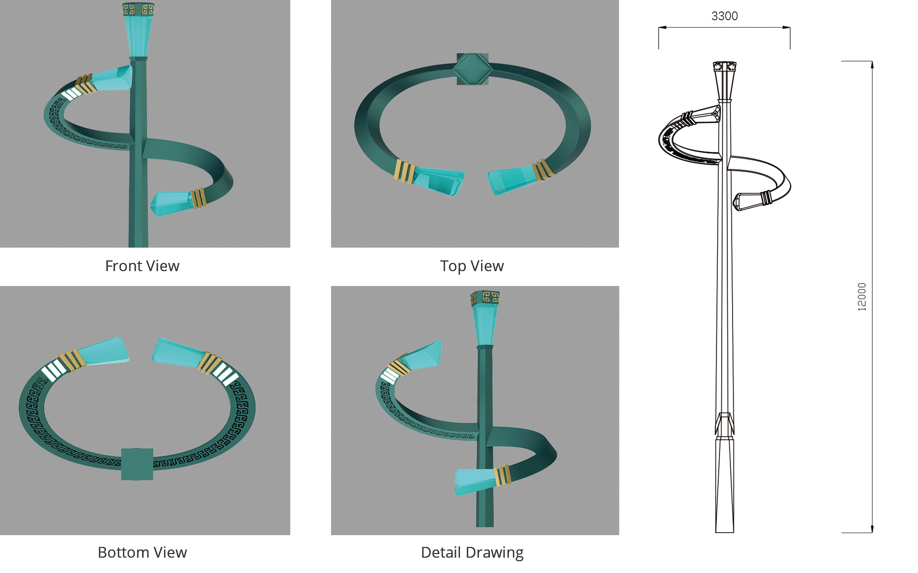 The LED light source is ingeniously configured in outdoor cultural customized lamps, replacing traditional sodium lamps and energy-saving light sources. With revolutionary innovation, it reduces the functional density of this type of decorative landscape street lamps without affecting usage and aesthetics; A professional single-lamp intelligent management system is configured to achieve scientific management of outdoor lighting;